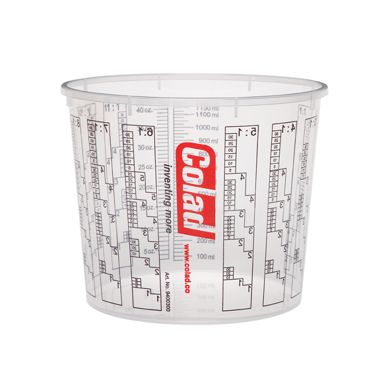 Paint mixing cup with scale from 1 : 1 to 1 : 10.